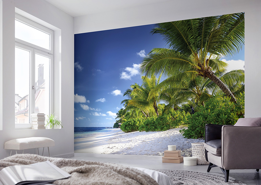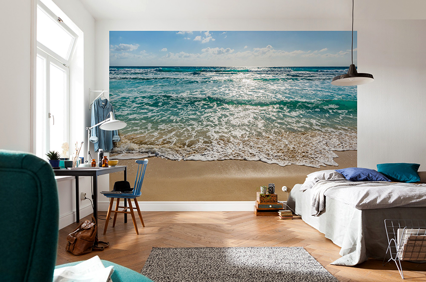 - Bilik dengan dinding sempit dapat diperluas secara visual dengan menampal kertas dinding dengan garis mendatar. Pantai dengan pemandangan permukaan laut akan kelihatan baik.