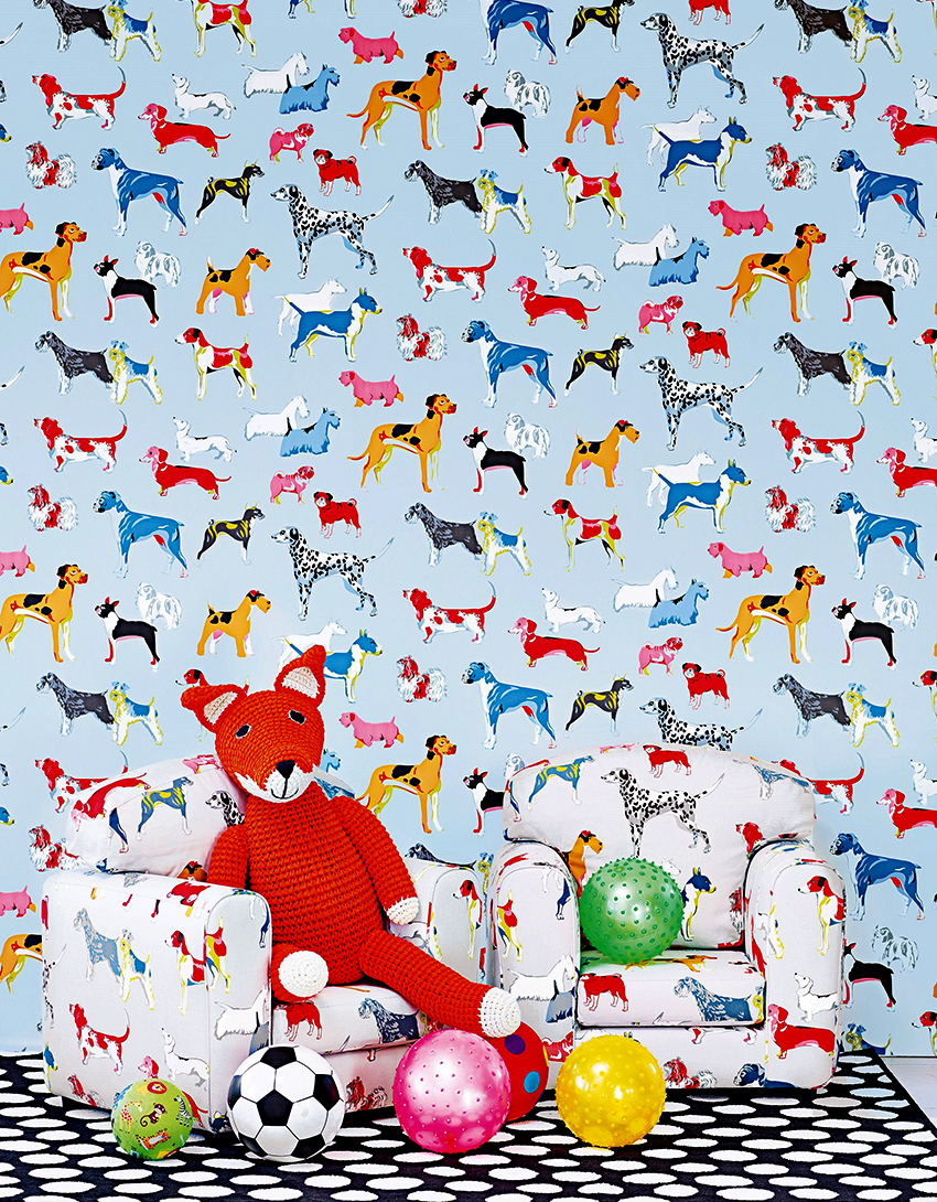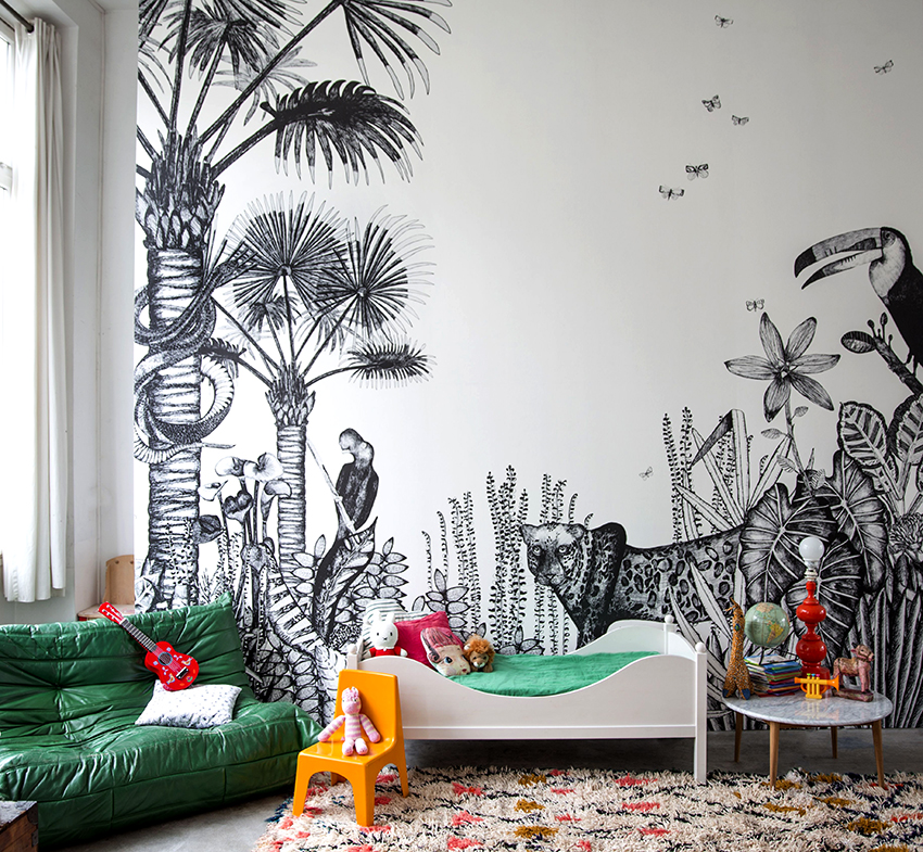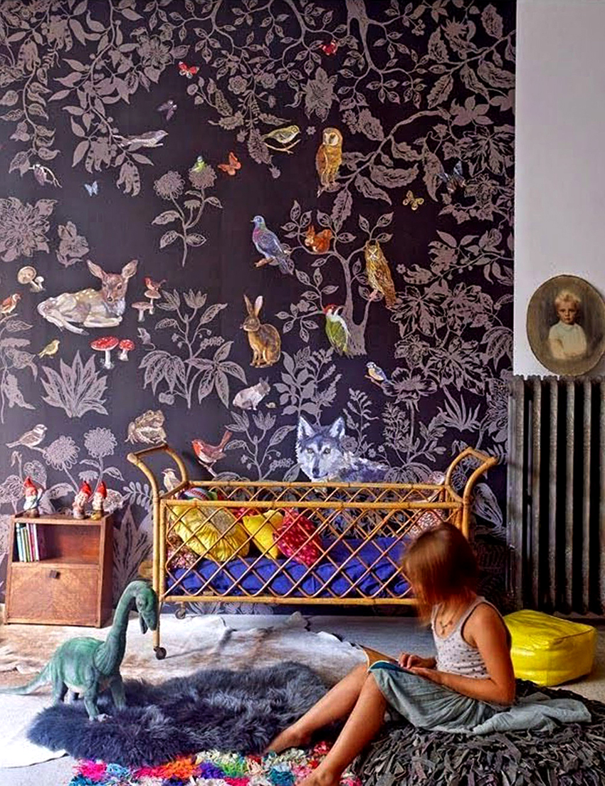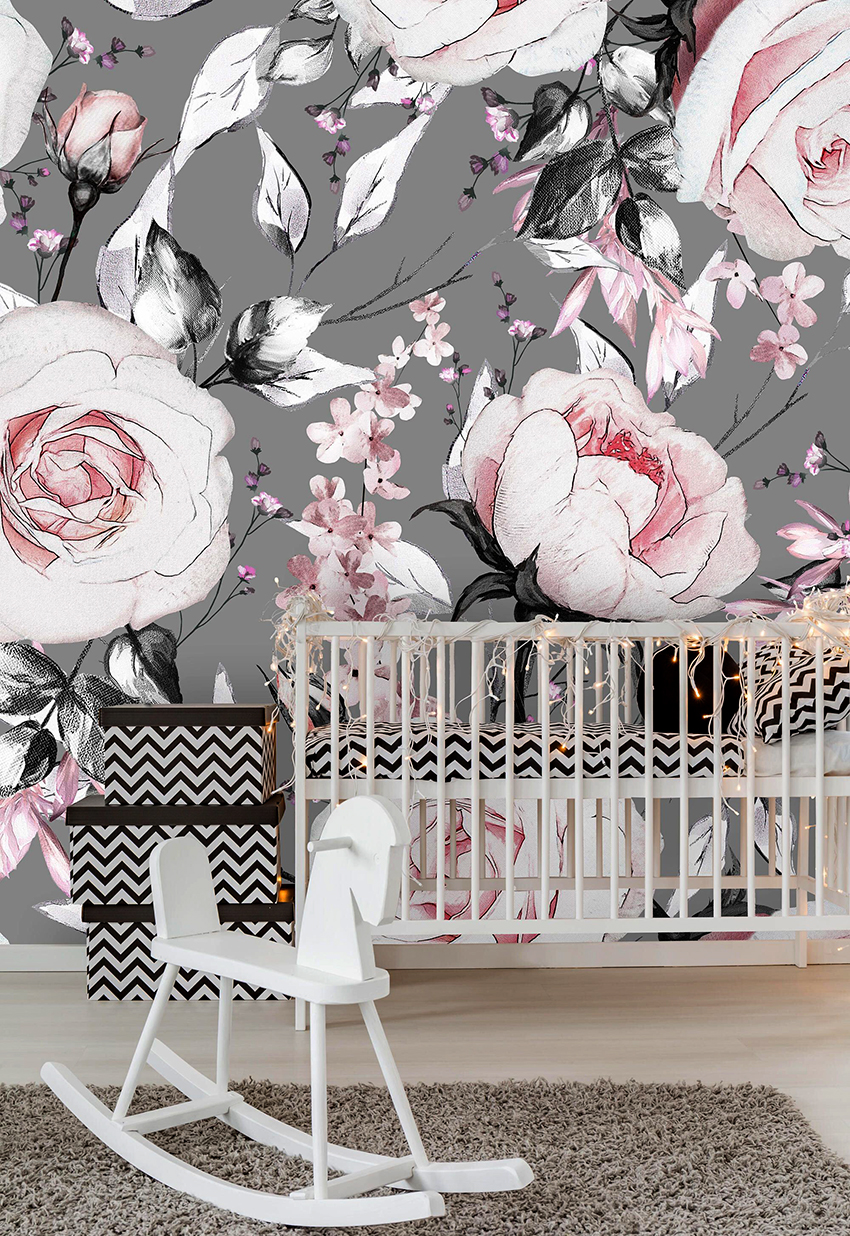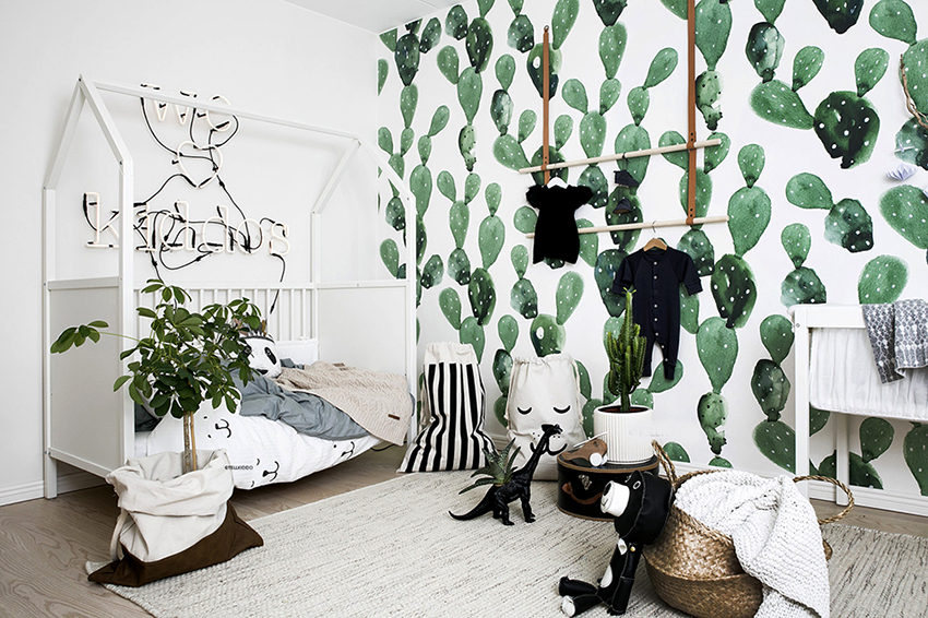 Di tapak semaian yang luas, anda boleh menggunakan kertas dinding foto yang terang dengan corak yang besar