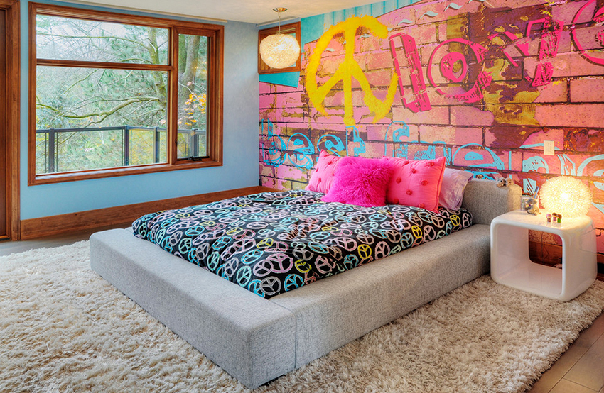 Untuk bilik tidur remaja, tiruan kertas dinding dari batu bata atau batu adalah optimum. Ia sangat baik apabila kesan unsur jatuh, lubang, lecet atau tetulang yang menonjol dibuat pada permukaan. Oleh itu, ia akan mewujudkan bilik tidur moden yang bergaya namun selamat. Sekiranya anda menggunakan gabungan pelbagai gambar latar, bilik tidur remaja juga akan berjaya dizonkan. Dalam kes ini, batu digunakan di kawasan kerja, dan gambar dipasang di dinding di atas tempat tidur, yang sesuai dengan suasana hati dan minat anak. Petua lain untuk memilih wallpaper paling bergaya: