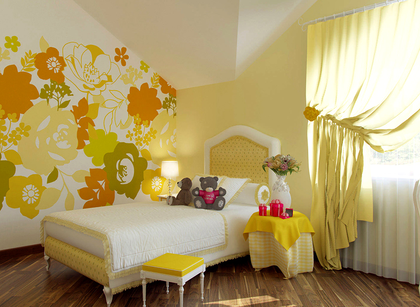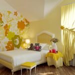 Kertas dinding foto dengan penggunaan warna kuning dan oren akan membawa nota keselesaan, kehangatan dan cahaya matahari ke bilik tidur. Bunga kuning besar kelihatan sangat cantik dengan fokus besar dengan titisan embun pada latar belakang yang berlorek. Padang dandelion kuning dengan latar rumput hijau dengan chamomile yang disorot di tengahnya akan menjadi perincian aksen yang sesuai. Kertas dinding seperti itu tidak akan cepat bosan dan akan memberi kesan positif pada mood.
