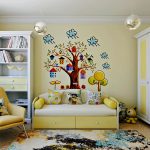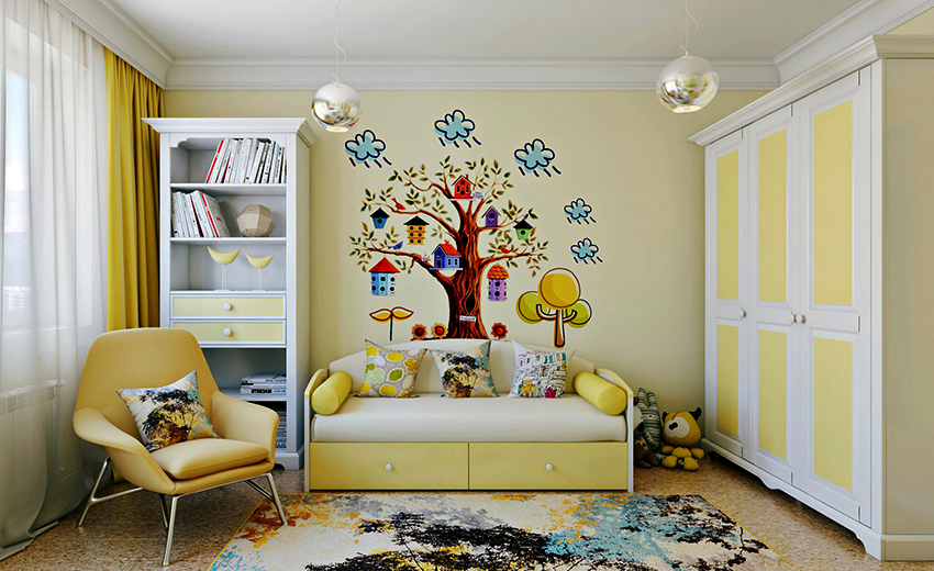 Warna universal untuk dinding taska berwarna putih, krim atau warna kuning air. Peraturan asas untuk memilih gambar untuk ruangan dengan parameter yang berbeza: