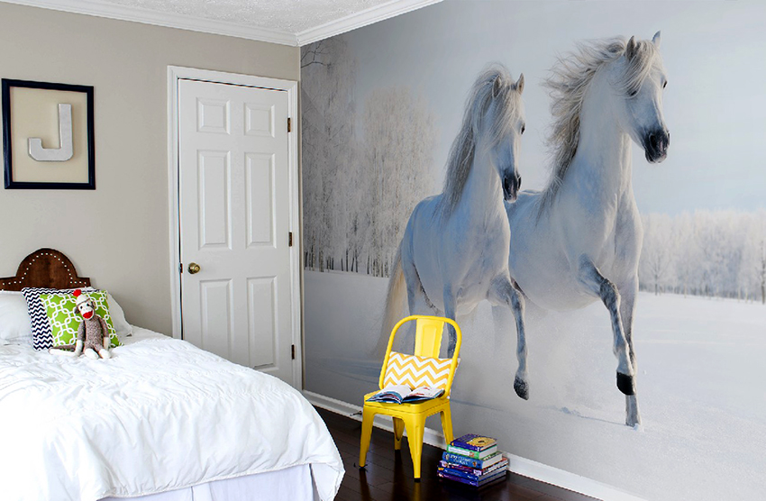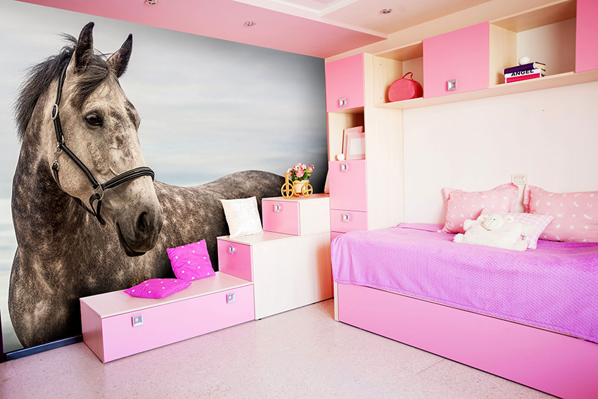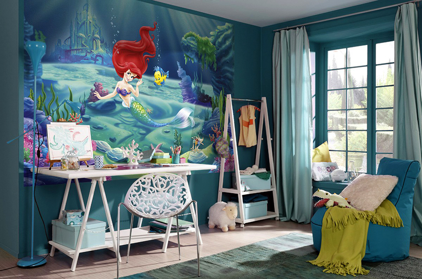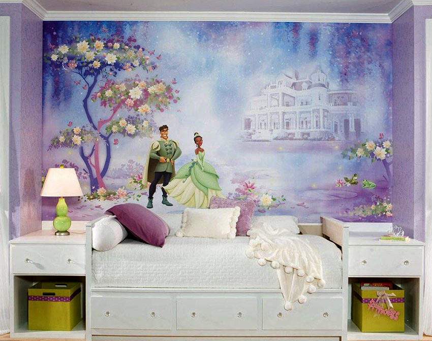 Semasa membeli mural dinding untuk bilik tidur kanak-kanak, anda harus memilih pilihan yang selamat. Kertas dinding dengan gambar yang dicetak dengan dakwat lateks harus digunakan di sini, pelarut eko dan cat berasaskan air tidak sesuai dalam kes ini. Dianjurkan untuk memberi keutamaan pada kertas dinding di atas kertas atau sandaran bukan tenunan tanpa penggunaan vinil.