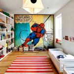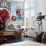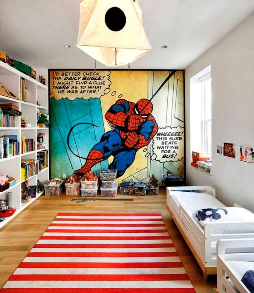 Anda tidak boleh memilih plot kertas dinding sendiri, lebih baik melibatkan anak dalam proses ini, terutamanya jika dia berumur lebih dari 3-4 tahun. Bilik tidur kanak-kanak moden boleh dihiasi menggunakan kertas dinding dengan pemandangan, bingkai dari kartun kegemaran anda, cerita hebat. Kertas dinding dengan gambar rak dengan buku kelihatan sangat baik di kawasan kerja. Dalam kes ini, rak sebenar boleh diletakkan di dekat dinding, yang akan meneruskan idea gambar. Ciri-ciri pemilihan kertas dinding gambar untuk kanak-kanak bilik tidur bergantung pada usia kanak-kanak: