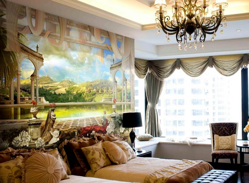 Juga, di bilik tidur kecil, anda sering dapat menemui mural dinding di dinding dengan tingkap, yang menggambarkan tirai mewah yang terbuat dari kain mahal, dan tingkap itu sendiri dalam keadaan ini ditutup dengan bantuan tirai Rom yang serupa warna. Dalam kes ini, kemewahan ditambahkan ke kawasan pedalaman tanpa menggunakan ruang kosong tambahan sentimeter, anggaran untuk membeli langsir mahal sebenarnya dijimatkan.