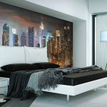 Titik seterusnya yang harus anda perhatikan adalah tema wallpaper foto. Lukisan dengan abstraksi dinamik di bilik tidur tidak berguna, kerana lama-kelamaan ia dapat mengganggu dan mengganggu keadaan emosi. Kanvas besar paling kerap diletakkan di atas kawasan dinding dan memakan semua ruang kosong. Rakan yang lebih kecil membolehkan anda memusatkan perhatian pada bahagian tertentu dari bilik, membuat kesan tingkap atau balkoni tambahan. Selalunya, dengan bantuan teknik ini, bilik kecil diperluas secara visual atau bilik tidur dengan ukuran yang tidak seimbang diperbetulkan.