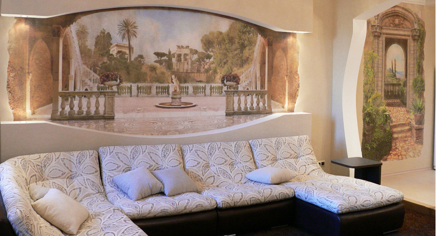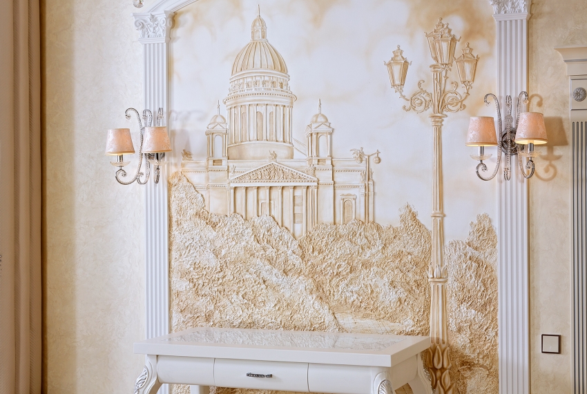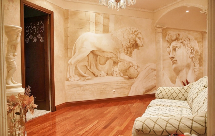- lukisan dinding pada asas elastik sangat sesuai jika terdapat keperluan untuk menyusun permukaan yang tidak rata, bulat atau bersudut. Biasanya, ruang di sekitar gambar juga dihiasi dengan plaster hiasan, yang mengelakkan penglihatan sempadan gambar yang jelas dan menjadikan lukisan dinding sebagai bahagian organik dinding;