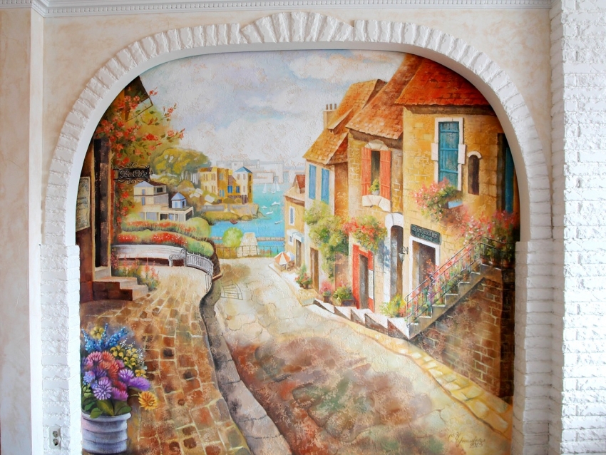 - lukisan dinding diterapkan pada plaster halus, yang memberikan gambaran bukan hanya dengan penampilan yang menarik, tetapi juga meningkatkan daya tahannya terhadap faktor luaran. Gambar hidup atau landskap masih berfungsi paling baik untuk teknik ini. Dan jika anda juga membuang lapisan atas fresco pasir, anda boleh mendapatkan gambar yang tidak biasa dengan kesan kuno;