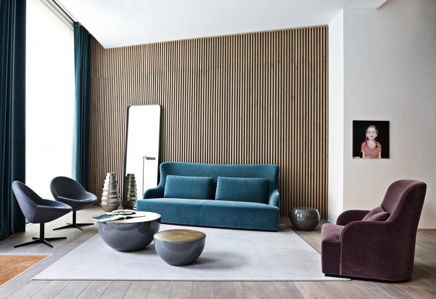 Walaupun terdapat pelbagai warna dalam rangkaian kertas dinding yang dicadangkan, pereka mengesyorkan menggunakan palet hangat dan tenang dalam reka bentuk ruang tamu.