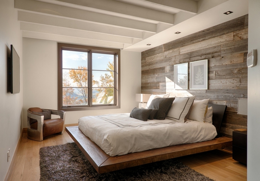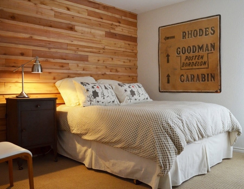 Bilik tidur digunakan untuk bersantai, jadi sangat disarankan untuk menggunakan kertas dinding yang dibuat dengan warna pasir, abu-abu muda, kuning air dan pastel untuk hiasannya. Varian menggunakan kombinasi kontras adalah mungkin. Untuk mendapatkan reka bentuk bilik tidur yang dinamis, disarankan untuk menggunakan lantai yang bergaya sebagai mozek, yang terdiri dari kepingan kayu.