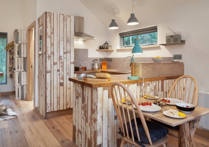 Kertas dinding dengan corak papan kayu berumur digunakan untuk menghiasi dinding bilik Provence atau loteng