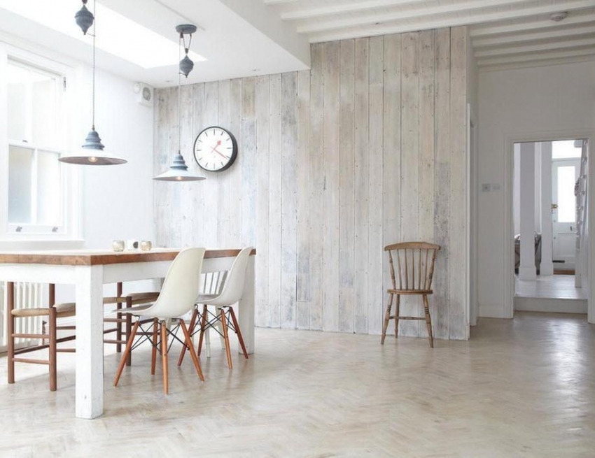 Untuk hiasan dalaman dalam warna yang terang, anda boleh menggunakan kertas dinding dengan kesan papan pudar dan bingkai kayu oak atau mahoni yang berbeza