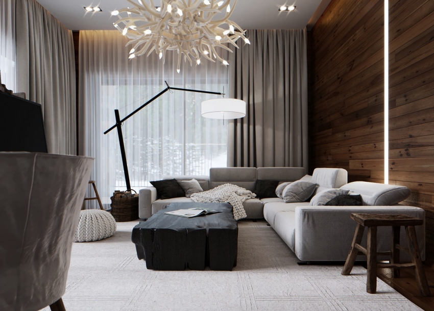 Di bahagian dalam ruang tamu, kaedahnya sering digunakan menggabungkan bahan, dengan anggapan pemisahan mendatar dari kemasan. Untuk hiasan bahagian atas dinding, kertas dinding dengan corak kecil atau kanvas dalam skema warna tunggal digunakan, dan untuk reka bentuk bahagian bawah, lapisan gelap yang meniru kayu digunakan. Gaya seperti moden, negara, klasik atau Provence sesuai di bilik ini.
