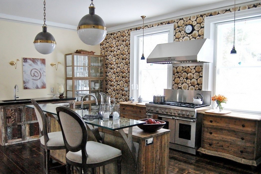 Di dapur, kawasan kerja biasanya dihiasi dengan kertas dinding seperti itu, di mana gabungan perincian kecil akan kelihatan paling menguntungkan. Untuk bilik ini, disarankan untuk memilih penutup bukan tenunan. Adalah wajar agar warna perabot selaras dengan warna hiasan dinding. Untuk ruang makan, mural dengan tiruan papan kayu dalam warna gelap atau terang atau dengan gambar landskap hutan sesuai.