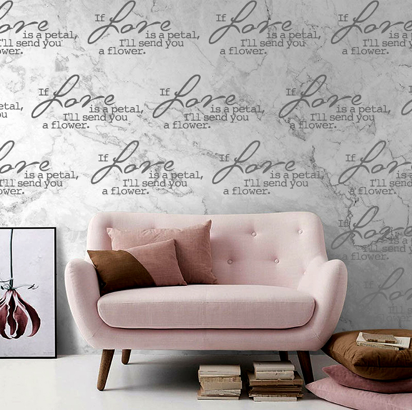 Kertas dinding dengan teks yang dilukis dengan pena, dengan ujung frasa yang sedikit pudar, dengan menarik akan menekankan gaya berkaitan Provence, Shabby Chic, Art Deco. Prasasti terang, menyapu dan menarik, sesuai untuk boho moden. Gaya ini menganggap sebilangan besar objek, kerusuhan warna dan kebebasan kombinasi warna.