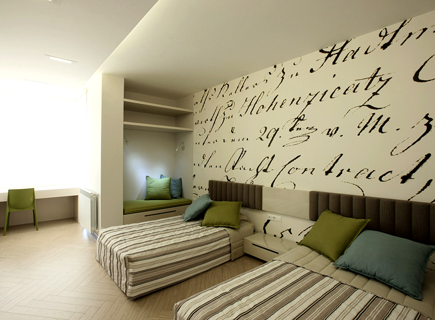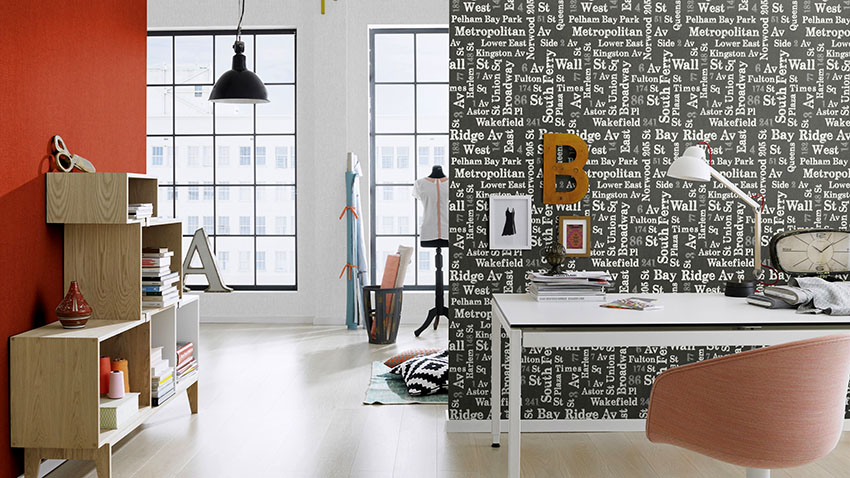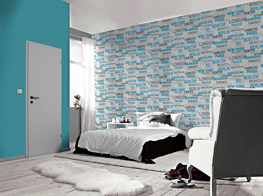 Bahan penamat juga dihasilkan yang sesuai dengan ciri reka bentuk kawasan di atas. Kertas dinding dengan prasasti dalam pembuatan dalaman remaja yang kreatif agak biasa. Ini adalah kanvas terang dengan tulisan putih dan hitam, surat berukuran besar yang tersebar secara kacau, cetakan, keratan surat khabar.