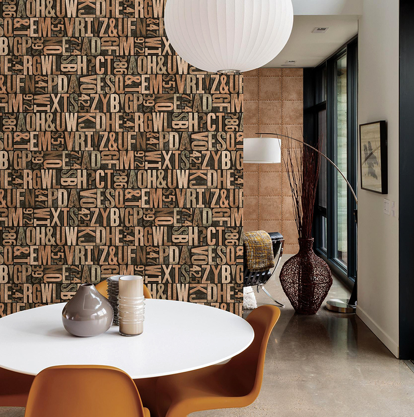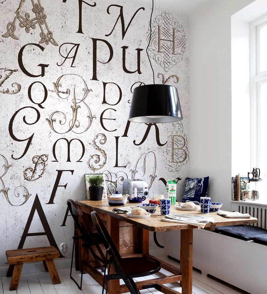 Hari ini, huruf sebagai kaedah reka bentuk digunakan secara aktif dalam pembuatan hiasan dalaman. Kertas dinding dengan tulisan boleh didapati di mana-mana syarikat yang menjual produk tersebut.