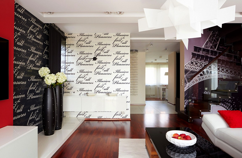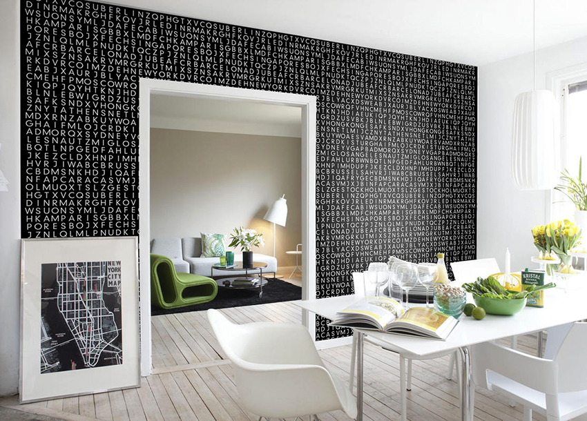 Varian kertas dinding yang tidak biasa untuk dinding boleh dianggap sebagai kanvas putih dengan prasasti hitam. Produk sedemikian digunakan di bahagian dalam di mana semua permukaan dinding berwarna putih. Cetakan dipilih bukan dengan sekumpulan huruf yang kacau-bilau atau teks yang berulang, tetapi dengan makna semantik. Dengan penambahan hiasan dinding yang terampil dengan perabot yang sesuai, bahagian dalamnya berubah menjadi halus dan elegan.