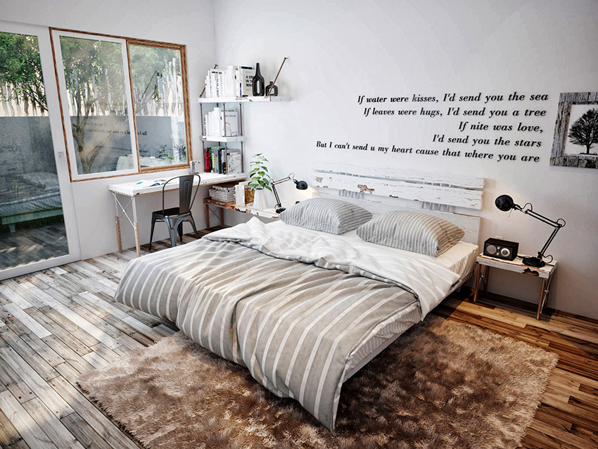 Sesuai untuk gabungan - kertas dinding dengan prasasti dan kain biasa dengan kualiti yang sama. Foto dalaman dengan reka bentuk yang serupa ditawarkan di Internet. Bilik-biliknya dibezakan dengan reka bentuk laconic dan lengkap, yang penting untuk persepsi umum mengenai bilik.