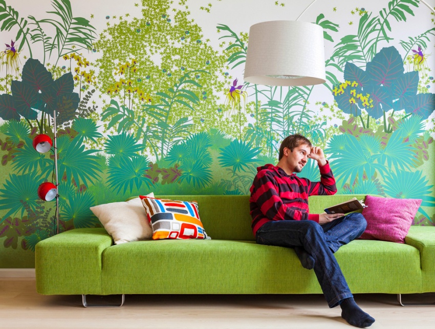 Nasihat berguna! Semasa menggunakan kertas dinding foto di ruang tamu, harus diingat bahawa mereka tidak hanya menutup dinding, tetapi membuat zon menarik di dalam ruangan.