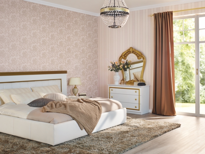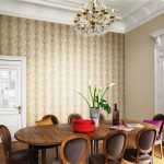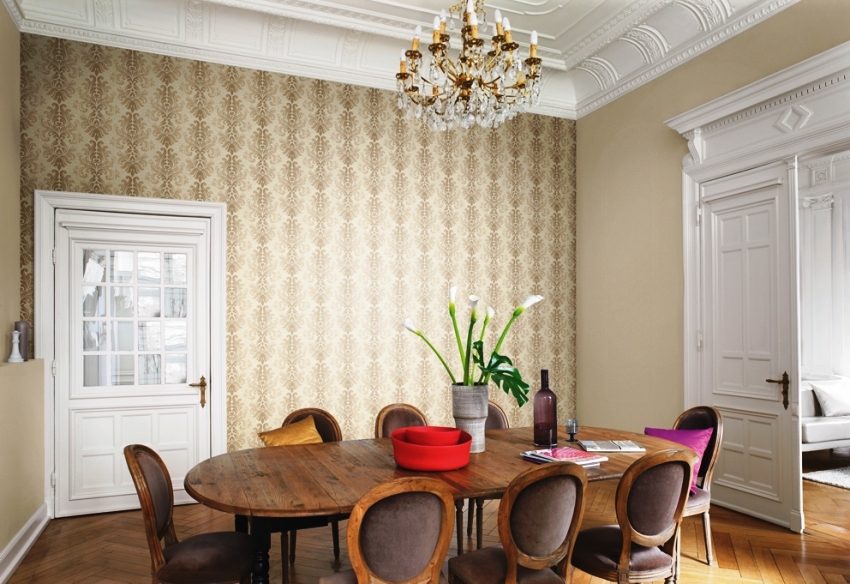 Semasa memilih kertas dinding klasik, anda juga harus mempertimbangkan jenis perabot. Sekiranya ini adalah model lama, lebih baik menghias dinding dengan monogram yang rumit. Jalur sesuai untuk perabot moden. Pilihan sejagat adalah corak damask.