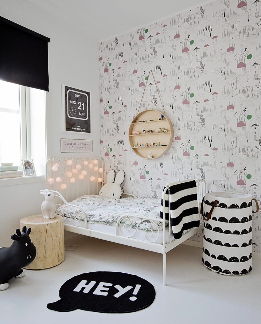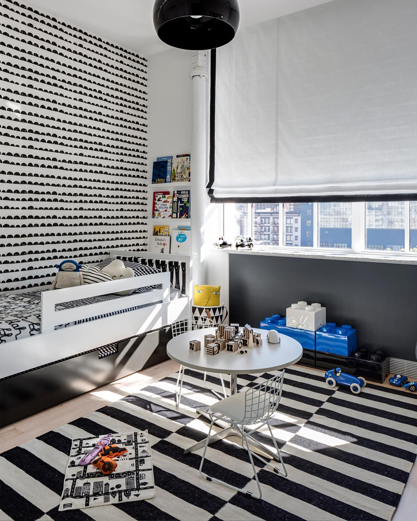 Tema geometri dianggap universal, yang sesuai untuk kanak-kanak dari semua peringkat umur dan jantina. Hiasan geometri dapat dipersembahkan dalam skema warna apa pun yang akan mewujudkan suasana tertentu di dalam bilik. Kotak dan berlian adalah simbol ketertiban. Garis lurus mewakili aktiviti dan dinamisme. Kertas dinding dengan titik polka akan menambah kekhusyukan, romantik dan ringan pada bahagian dalaman.