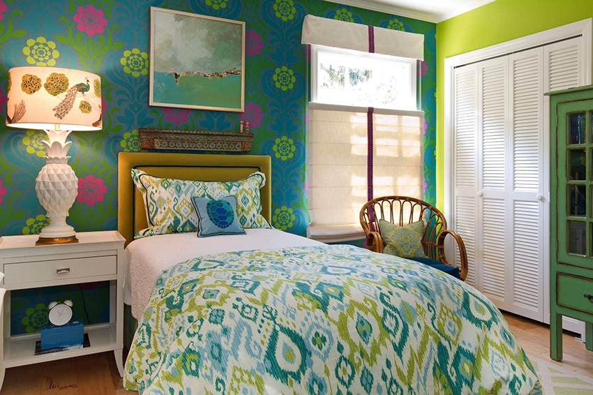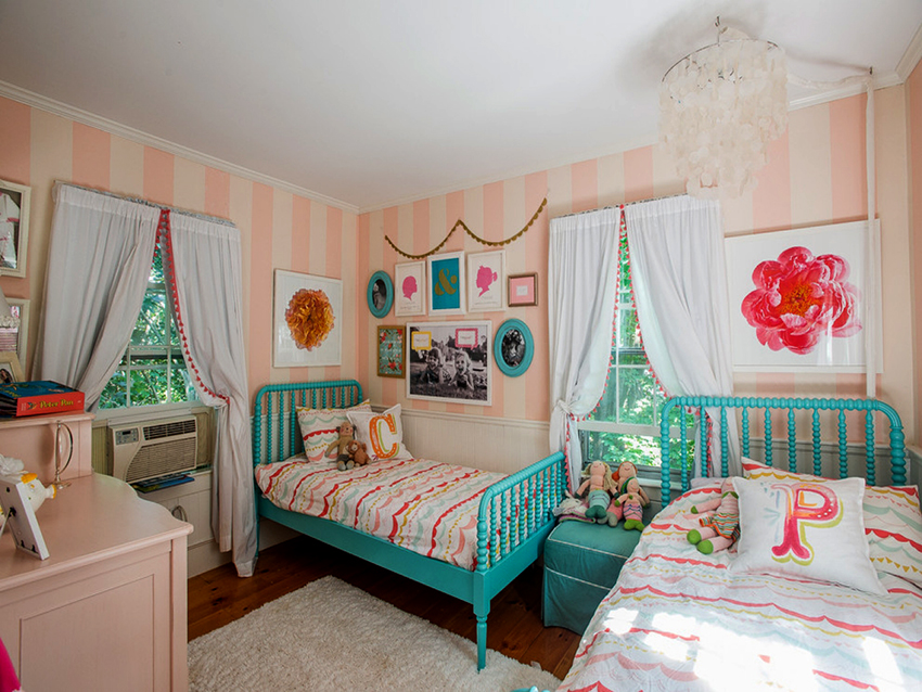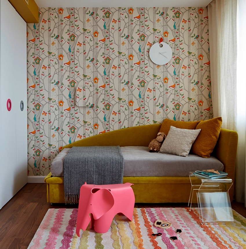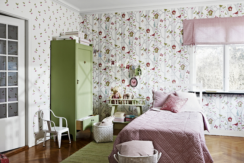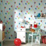 Pilihan warna kertas dinding juga bergantung pada lokasi bilik kanak-kanak. Sekiranya ruangan mempunyai orientasi selatan, lebih baik menempelkan dinding di palet tenang pastel. Warna cerah dan terang boleh menyebabkan kegembiraan anak meningkat, akan mengalihkan perhatiannya dari aktiviti pendidikan dan rehat yang tenang. Nada panas sesuai untuk menyelesaikan kawasan permainan di dalam bilik.Mereka menyumbang kepada peningkatan visual ruang. Bilik-bilik menghadap ke utara dihiasi dengan palet lembut dan hangat menggunakan warna merah jambu, kuning, oren dan hijau.