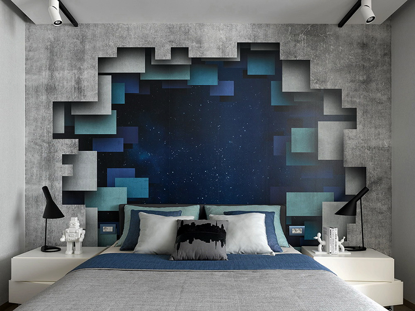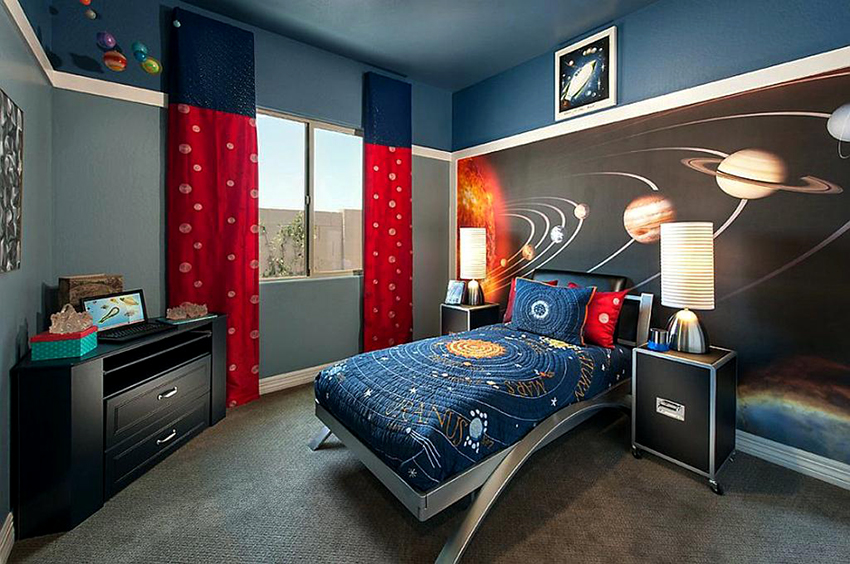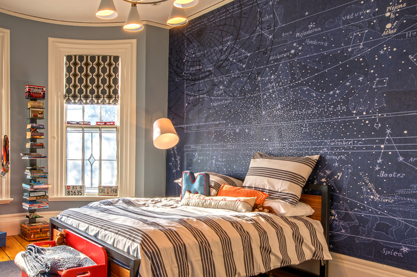 Tema ruang tidak kurang relevan.Koleksi kertas dinding mengandungi pemandangan yang realistik atau dilukis dengan buruj, planet, kapal angkasa. Kertas dinding dengan bintang adalah pilihan serba boleh yang sesuai dengan lelaki dan perempuan. Kanak-kanak lelaki juga akan senang dengan produk yang menggambarkan kereta dan barang sukan.