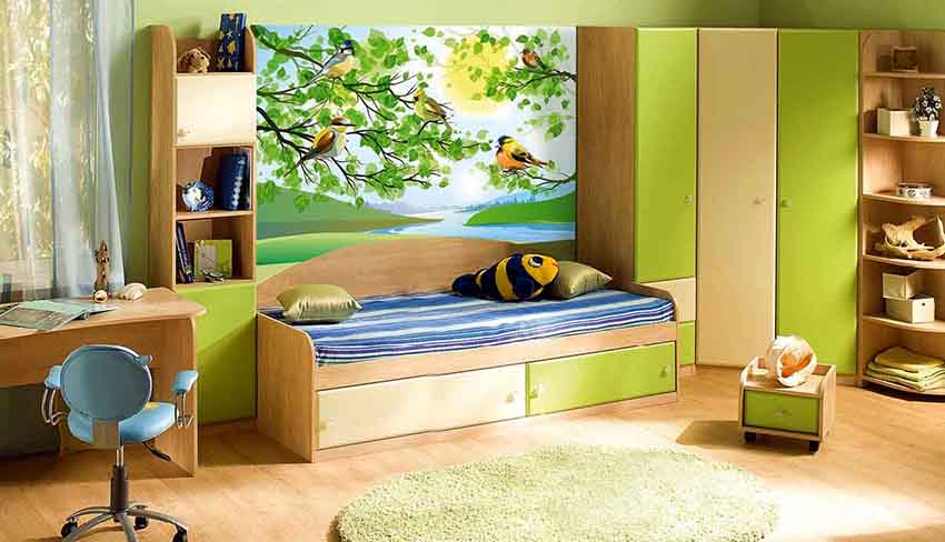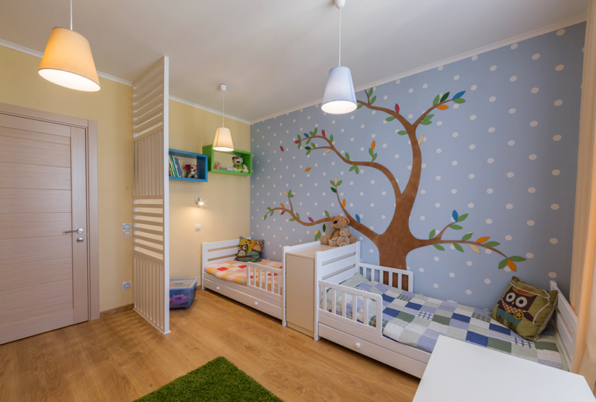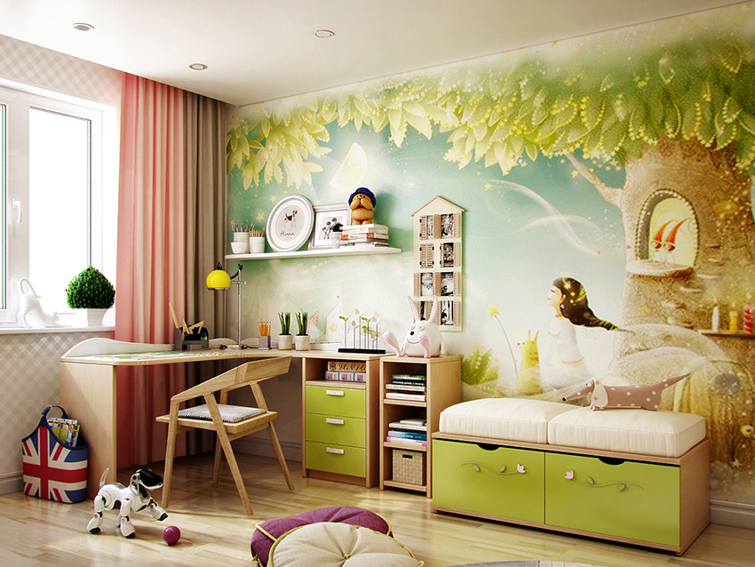 Nasihat berguna! Pilihan yang baik untuk menghias bilik kanak-kanak adalah hiasan latar foto, yang mana anda dapat mewujudkan suasana yang luar biasa di dalam bilik.