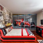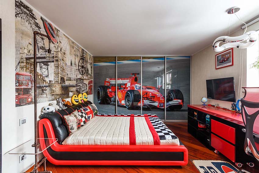Untuk kanak-kanak berumur lebih dari 3 tahun, anda boleh memilih kanvas yang kaya dan ceria. Kanak-kanak lelaki paling suka kereta. Pilihan yang sesuai ialah kertas dinding dengan gambar watak kartun "Kereta". Anda boleh melengkapkan konsep keseluruhan bilik dengan perabot bertema. Ia boleh menjadi tempat tidur dalam bentuk kereta, kapal atau kapal terbang.