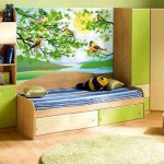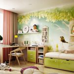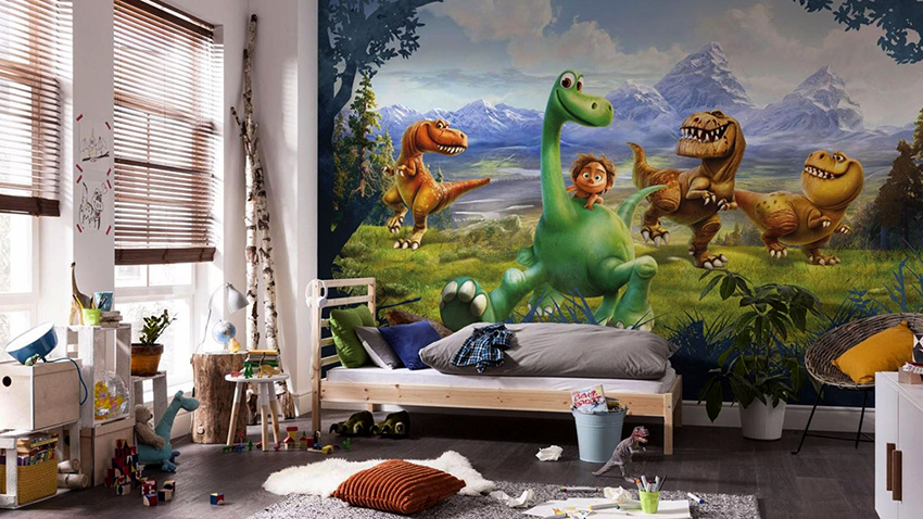 Pilihan yang mudah dan romantis yang sesuai untuk kanak-kanak perempuan adalah produk dengan rama-rama atau bunga. Untuk kanak-kanak lelaki, anda boleh mengambil gambar yang tidak biasa dengan tema dunia haiwan. Pilihan yang paling relevan dan dituntut adalah permukaan dengan dinosaur. Bilik dengan pokok di salah satu dinding akan kelihatan asli. Kertas dinding seperti itu dapat dilengkapi dengan pelekat bertema dengan gambar haiwan dan bunga, mengubah sudut menjadi hutan dongeng, seperti yang ditunjukkan pada foto kertas dinding di ruangan itu.
