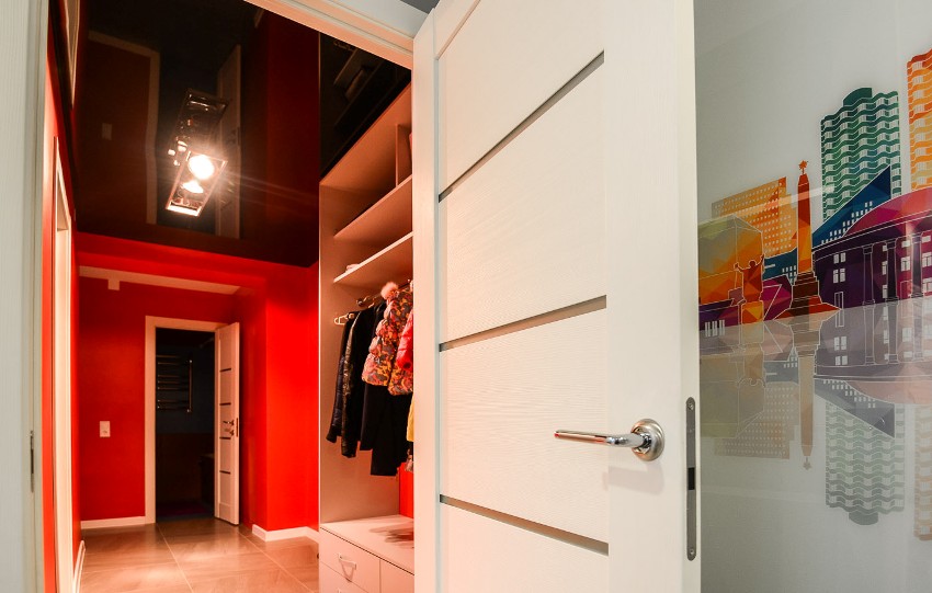 Sekiranya koridor mempunyai bentuk yang betul, maka anda boleh menggunakan kertas dinding dengan warna terang. Koridor merah, kuning atau oren akan kelihatan jelas. Namun, dalam hal ini, lebih baik tidak menggunakan hanya kertas dinding biasa, tetapi memilih pilihan dengan cetakan atau bergaris. Lorong koridor yang terang akan mewujudkan suasana yang baik dan memenuhi keseluruhan apartmen dengan positif. Nada yang lebih dalam seperti biru atau burgundy, sebaliknya, akan menjadikan ruangan lebih keras dan klasik.