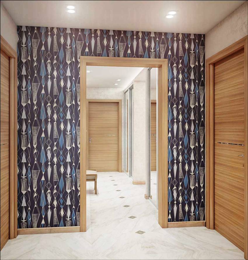 Penggunaan kertas dinding dengan tekstur dan corak yang berbeza membolehkan anda mengubah perasaan ruang lorong