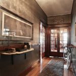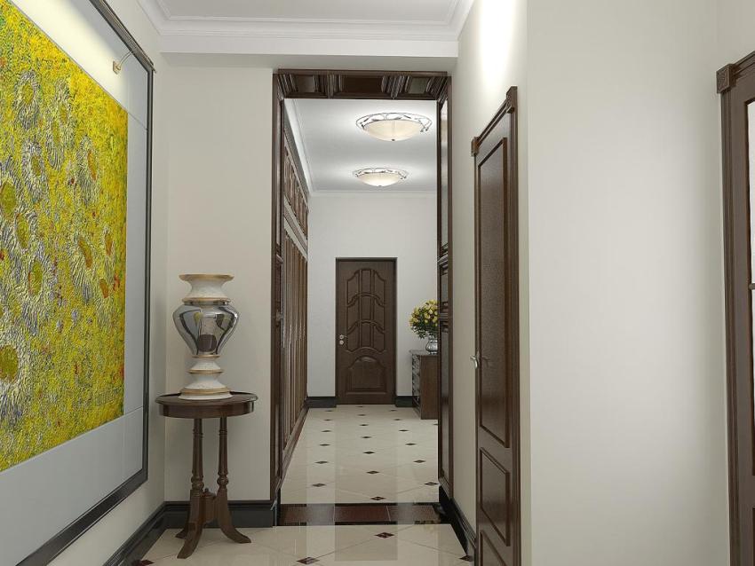 Pilihan lain untuk menghias koridor panjang adalah penggunaan kertas dinding gelap, yang digunakan untuk menampal dinding di sekitar pintu masuk, dan bahagian paling jauh dihiasi dengan kanvas yang lebih ringan. Lengkungan yang terletak di persimpangan dua warna akan melengkapkan reka bentuk koridor. Teknik ini akan mengembangkan ruangan secara visual.
