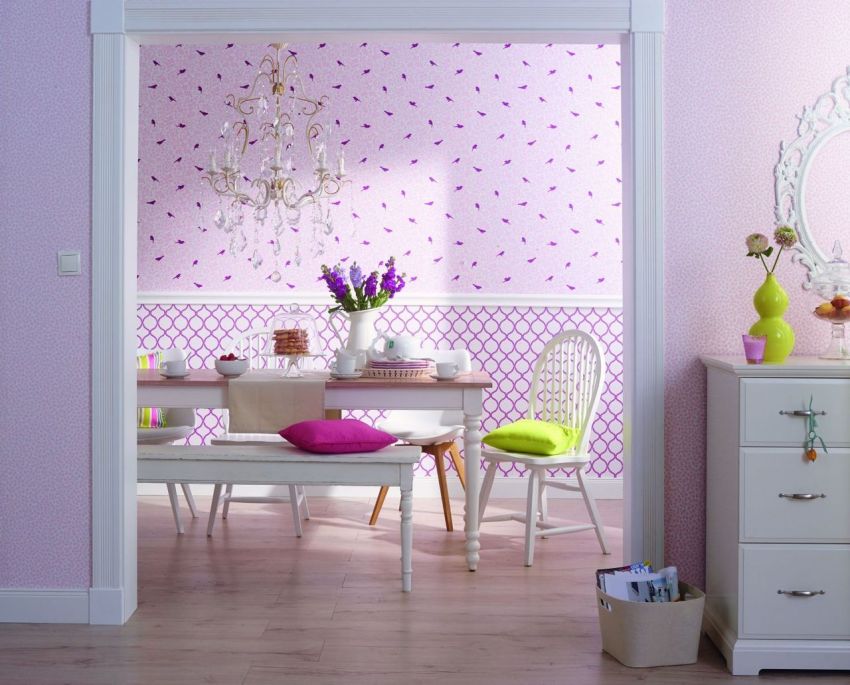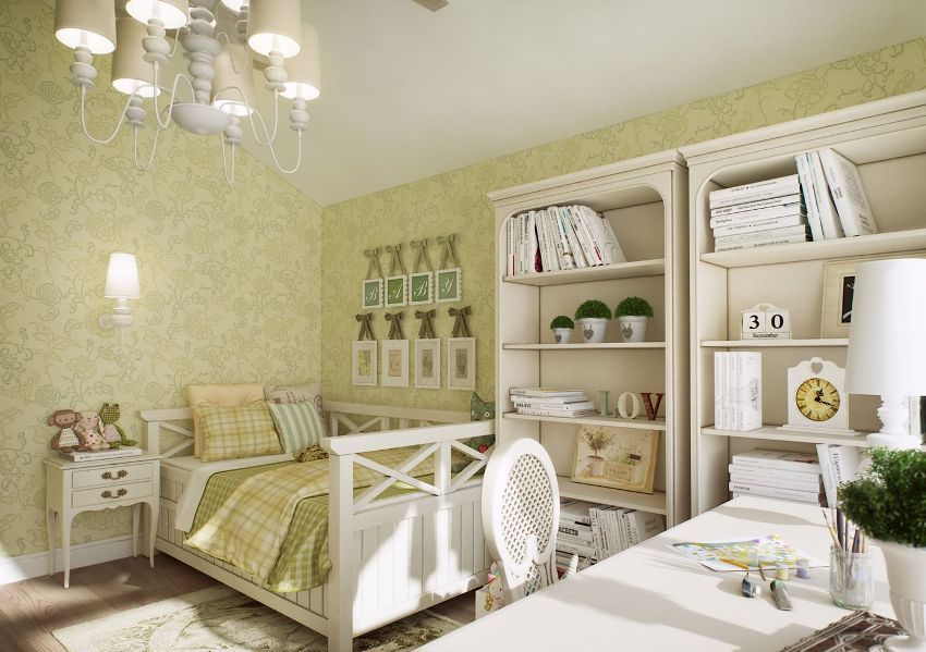 Sekiranya bilik itu dirancang untuk dihiasi dengan kertas dinding gaya Provence biasa, anda harus memilih kertas dinding untuk lukisan, yang warnanya dapat diubah dari masa ke masa, dengan fokus pada keinginan anak. Untuk bilik kanak-kanak, perlu menggunakan warna kuning air, hijau, kuning, pic, biru langit. Wallpaper mint, ungu dan pistachio akan memberi kesan yang menenangkan pada mood anak.