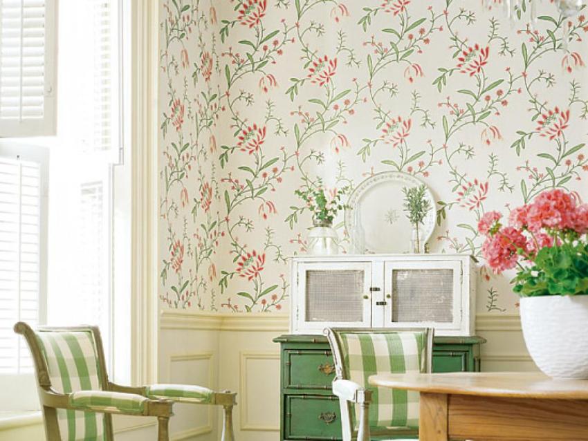Dihiasi dengan perincian kecil dan corak berulang, wallpaper gaya Provence secara visual akan menjadikan bilik lebih cerah dan selesa.