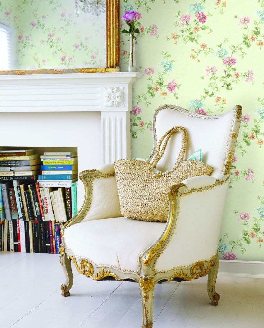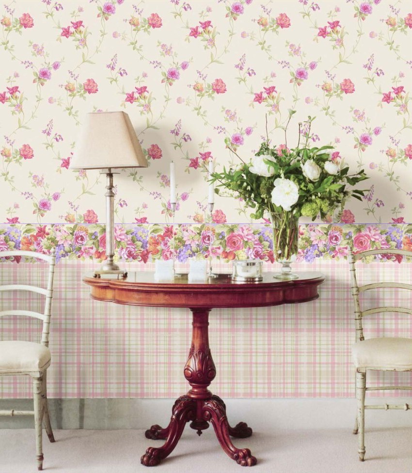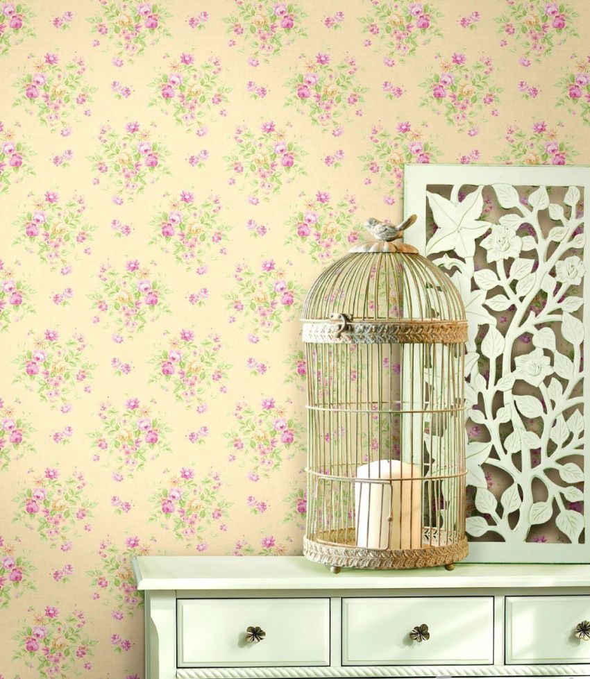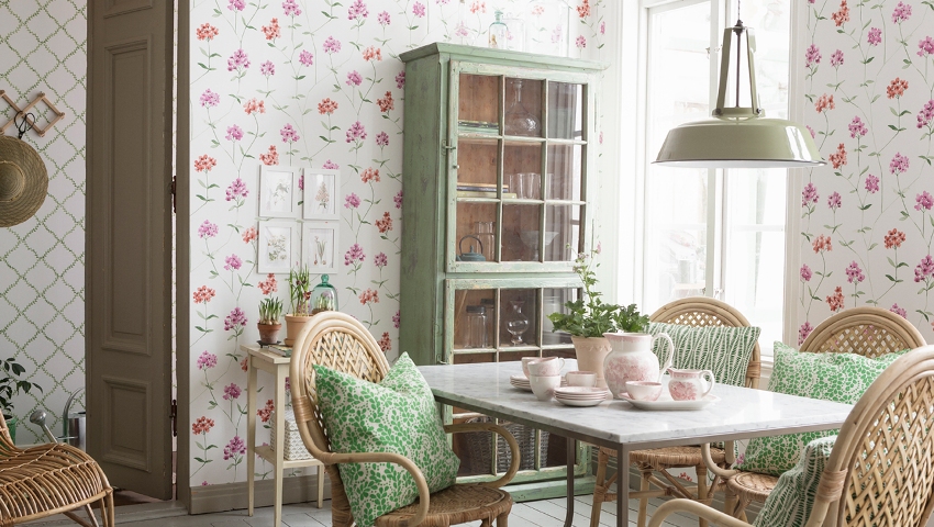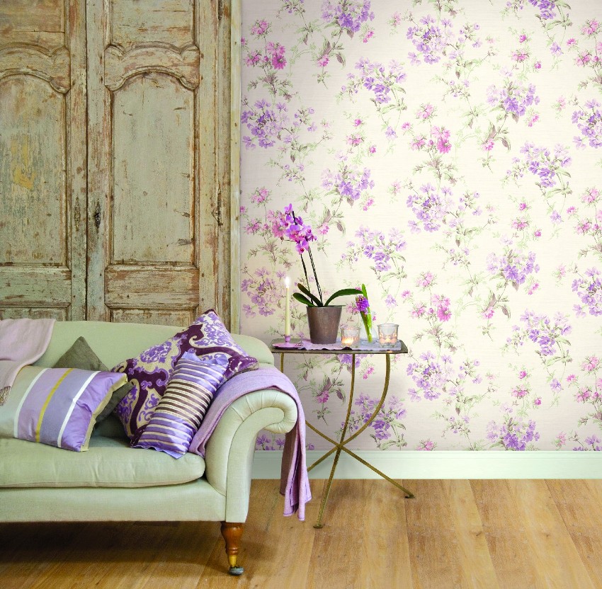 Kertas dinding untuk dinding gaya Provence dibezakan dengan warna lembut dan cetakan bunga