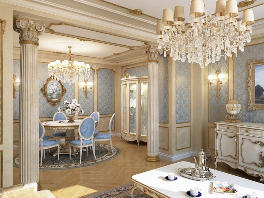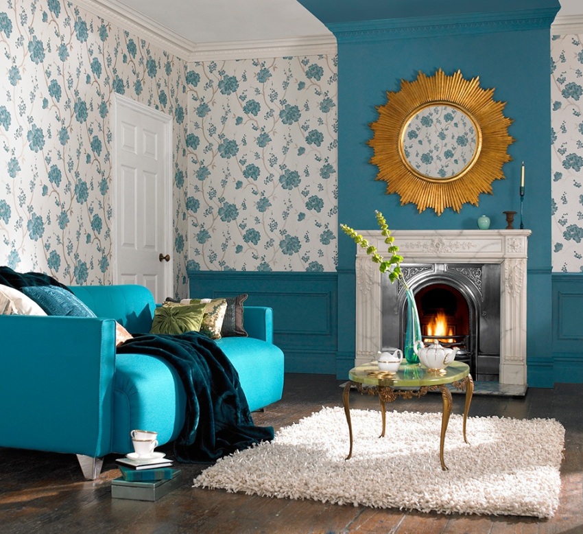 Untuk ruang tamu, anda tidak boleh menggunakan kertas dinding berskala kelabu-biru yang sejuk, yang akan menghilangkan keselesaan rumah, menjadikan bilik itu kusam dan tanpa ekspresi. Sekiranya kertas dinding mempunyai warna yang serupa, bahagian dalam bilik harus dilengkapi dengan tekstil kontras dalam warna hangat: biru, merah jambu, terakota dan pic.