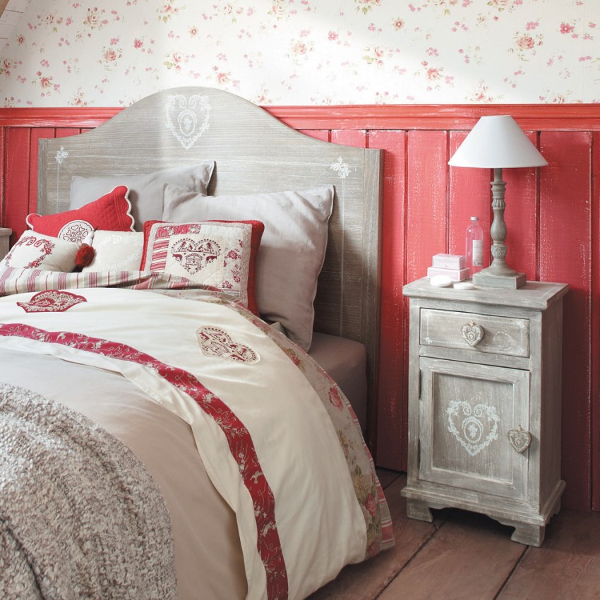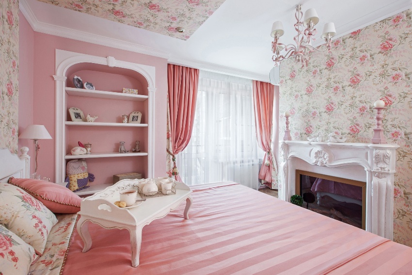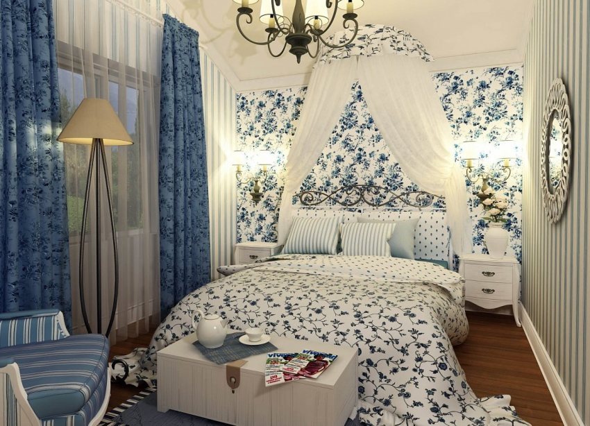 Bilik tidur dengan kertas dinding gaya Provence harus memancarkan kehangatan, ketenangan dan ketenangan