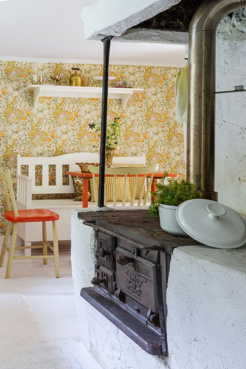 Nasihat berguna! Untuk sedekat mungkin interier dapur dengan tema desa lama, apron boleh dihiasi dengan kertas dinding yang meniru jubin atau bata.