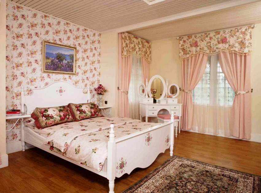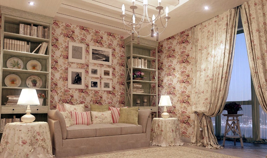 Kad pelawat arahnya adalah banyaknya cetakan bunga, yang semestinya ada di semua bahan penamat, yang jelas dipaparkan di foto dinding gaya Provence. Ruangan harus dipenuhi dengan cahaya alami, yang dicapai dengan menggunakan tulle yang mengalir cahaya di tingkap. Banyak aksesori hiasan yang diperbuat daripada tekstil dan porselin akan sesuai di sini. Perabot mestilah ringkas dalam reka bentuk tetapi kelihatan tidak biasa.