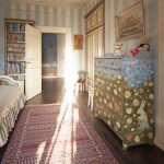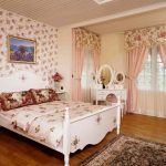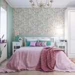 Nasihat berguna! Sekiranya kertas dinding dengan hiasan bunga kecil digunakan untuk menghias bilik tidur, disarankan untuk menggunakan perabot rendah untuk membuat perhentian tertentu yang membuka dinding bilik sebanyak mungkin.