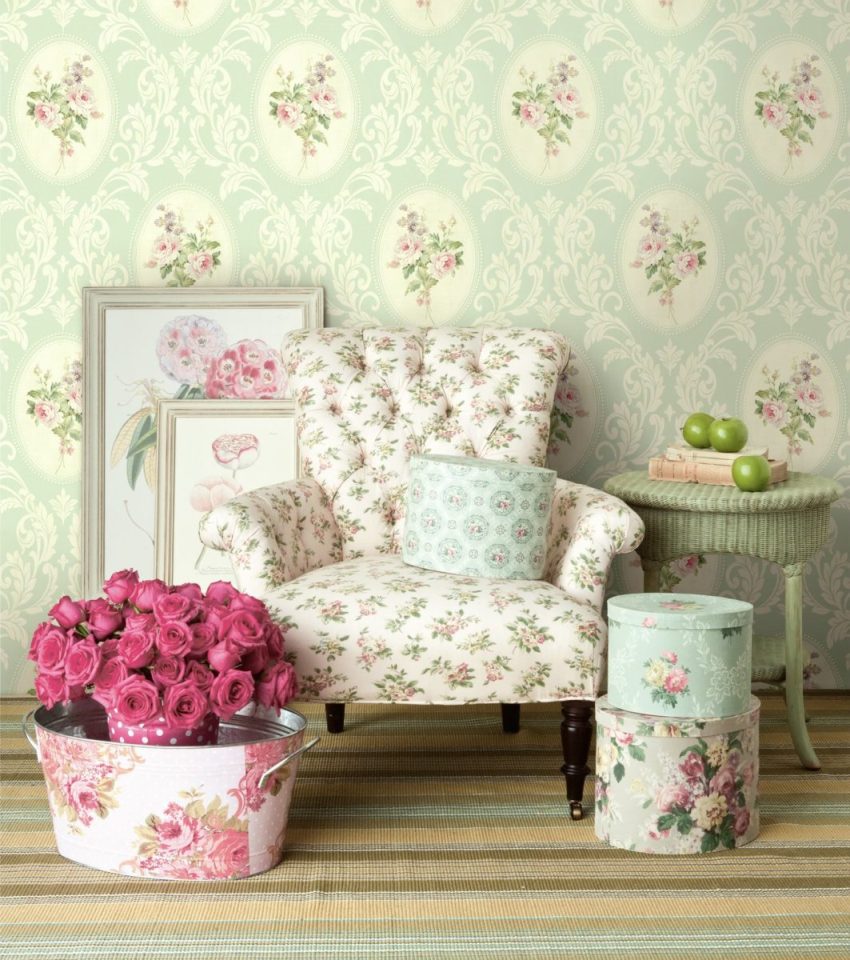 Kertas dinding dalam gaya Provence, anda dapat menyesuaikan warna perabot berlapis, bantal hiasan atau sprei