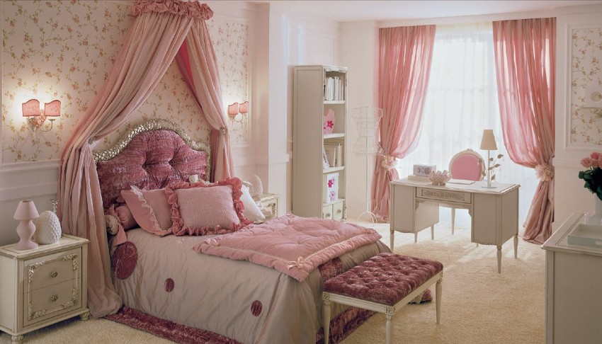 Bilik tidur biasanya merupakan ruang kecil yang tidak dibebani perabot.Itulah sebabnya syarat khas akan dikenakan di dinding. Kertas dinding untuk dinding di bilik tidur harus tenang, dengan warna pastel tradisional, tetapi dengan corak. Warna sejuk boleh dibenarkan di sini. Kertas dinding harus berwarna terang, mempunyai kecerahan yang tenang dan corak neutral yang boleh berbunga, berbunga, bergaris, diperiksa, atau mencerminkan pemandangan yang tenang. Untuk bilik tidur, lebih baik menggunakan kertas dinding dalam warna vanila, lavender, ungu, merah jambu, krim, ungu.