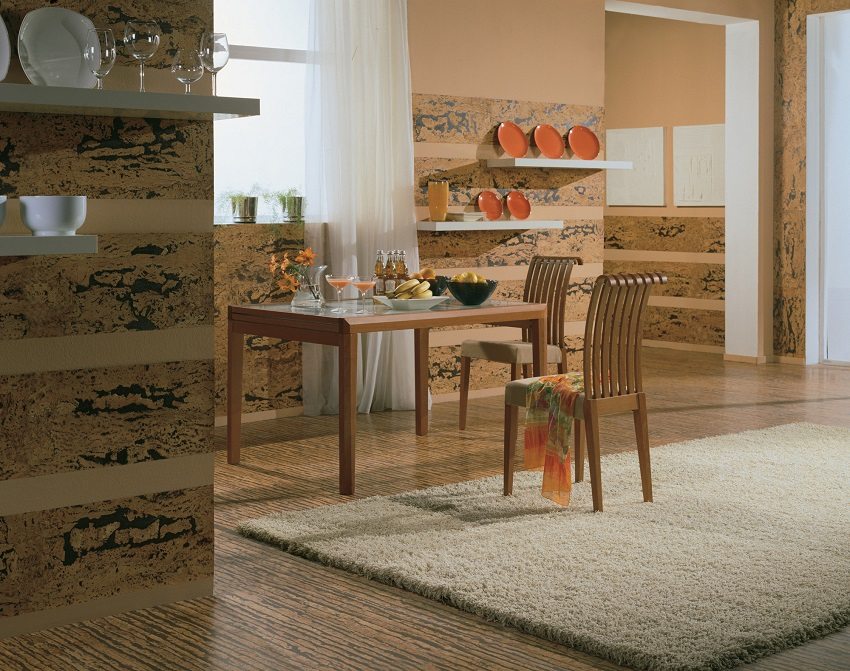 Foto panel gabus untuk dinding di pedalaman dengan jelas menunjukkan bahawa lapisan seperti itu akan kelihatan paling baik di bilik yang dibuat dengan gaya desa (negara) atau etnik (Jepun atau Mediterranean), dan juga di rumah negara.