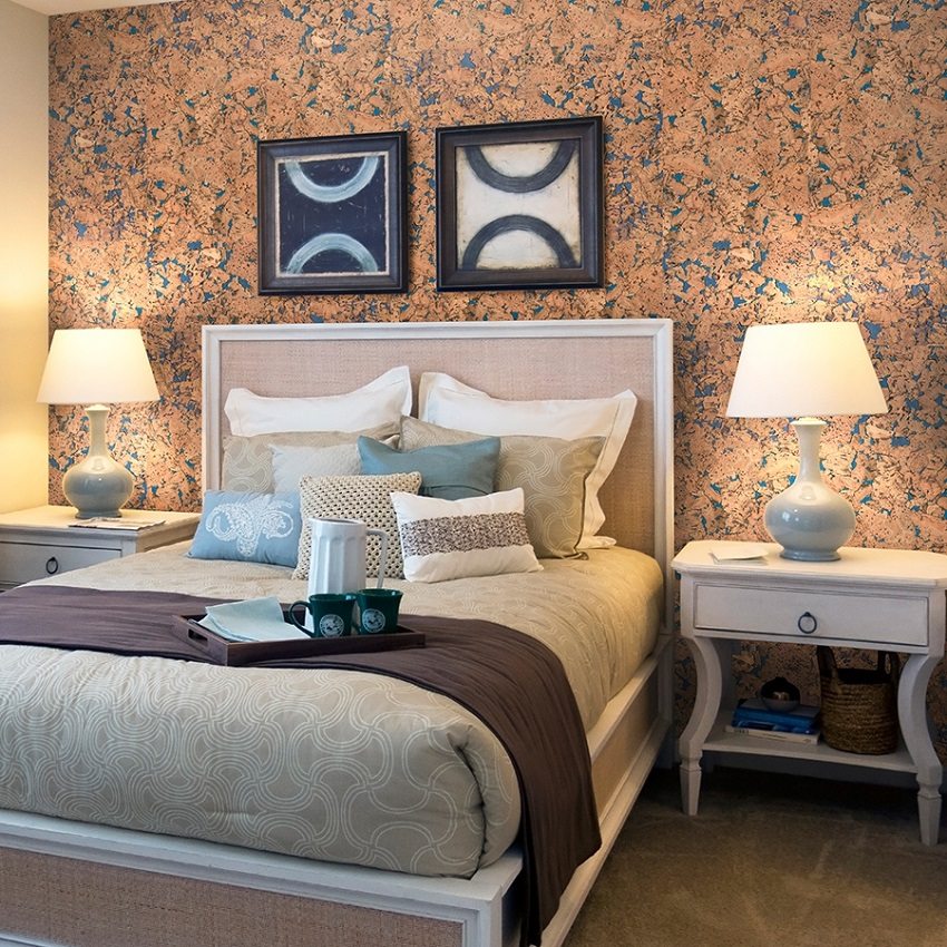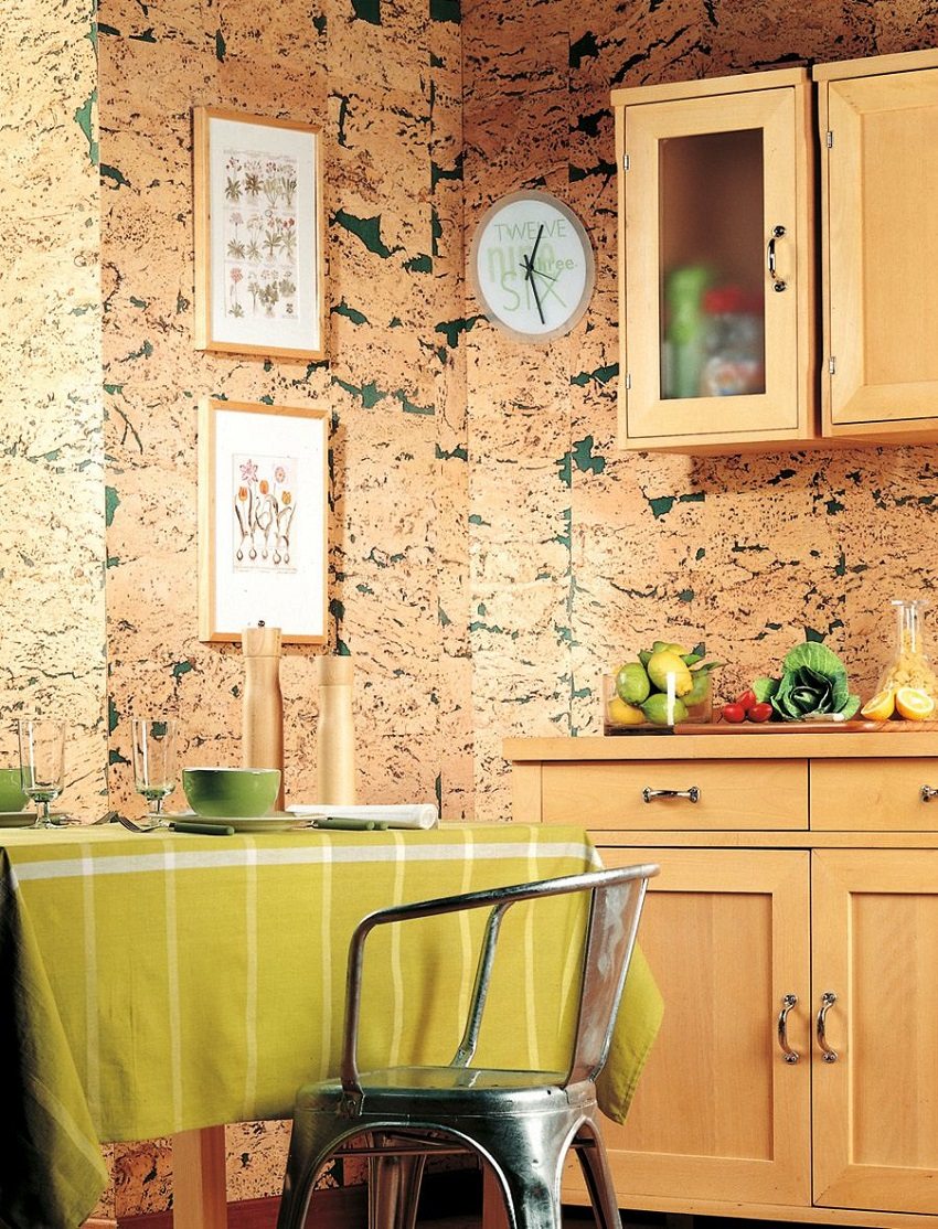 Kesan yang luar biasa dapat dicapai dengan menempelkan pelbagai warna kertas dinding gabus dalam bentuk mozek, corak berulang atau keseluruhan komposisi.
