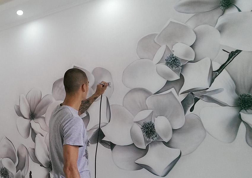 Teknik melukis dinding di jalan ini baru-baru ini mula digunakan untuk hiasan reka bentuk dalaman. Airbrushing membuka banyak peluang bagi artis untuk merangkumi pelbagai idea, berkat penggunaan berus udara (air brush). Kerana adanya penyesuaian kekuatan tekanan jet, anda dapat memperoleh latar belakang yang sekata dan membuat peralihan yang halus dan semula jadi antara warna. Gambar yang dihasilkan di dinding mencolok dalam kecerahan warna dan realisme.