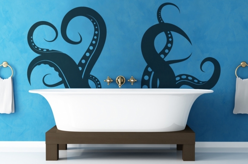 Selalunya, sempadan digunakan dalam reka bentuk bilik mandi atau bilik lain. Ia terdiri daripada corak berulang. Hasilnya adalah corak berterusan yang mengelilingi ruangan. Gambar bunga, tumbuh-tumbuhan, lumba-lumba sangat sesuai untuk tujuan ini. Lukisan yang dihasilkan adalah laconic dan terkendali. Stensil foto untuk hiasan dinding akan membantu anda menentukan pilihan corak untuk bilik mandi. Sekiranya anda ingin menjimatkan masa dan usaha, anda boleh membeli templat siap pakai di kedai bahan penamat terdekat.