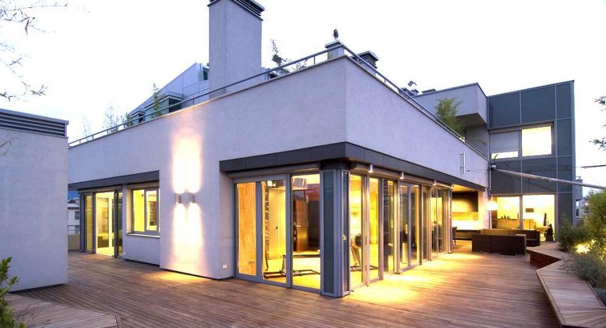 Beranda memerlukan perhatian khusus. Berkat kaca panorama, kawasan seluas 41,5 m² ini dapat melindungi orang dari cuaca buruk, dan bumbung yang tergantung menutup kawasan ini dari terik matahari.