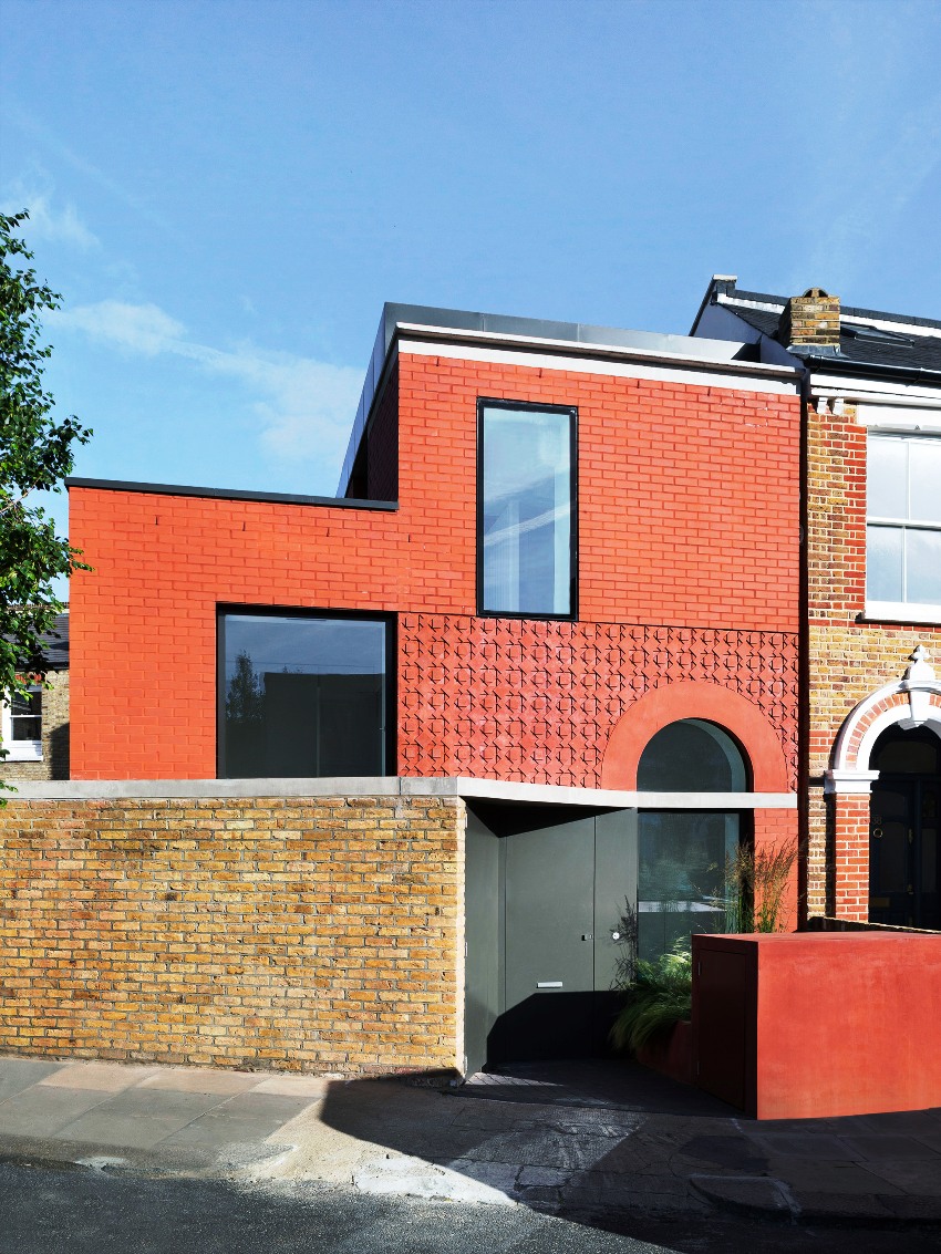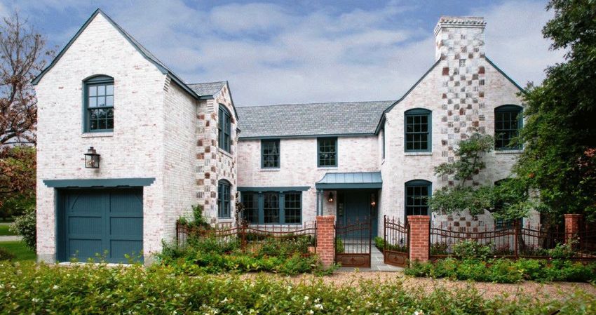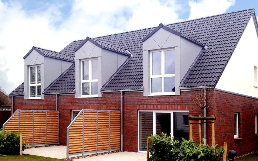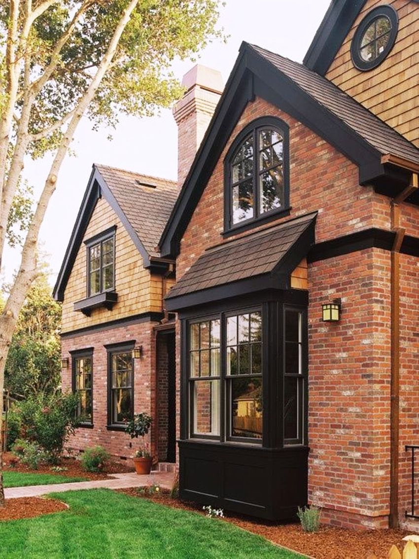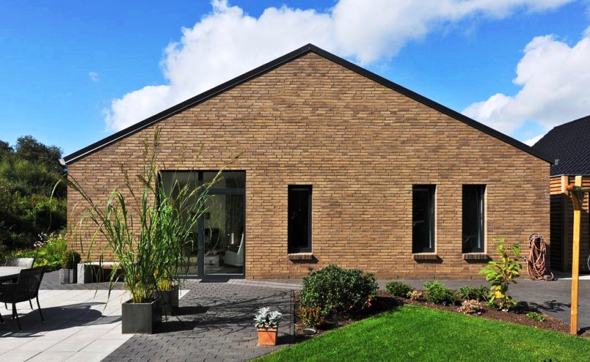 Batu bata yang cantik dapat menggabungkan dua warna (contohnya, merah dan coklat). Rumah-rumah gaya Eropah mempunyai tingkap segi empat kecil. Bahagian atas bukaan tingkap dilicinkan. Dianjurkan untuk memilih pintu dan tingkap agar naungannya berbeza dengan warna bangunan.