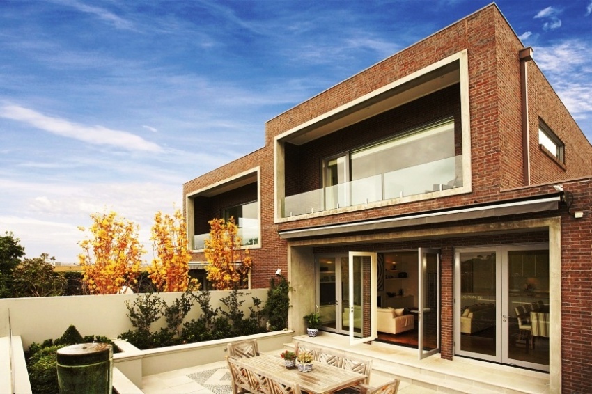 Fasad rumah bata dengan teres: kelebihan susun atur yang serupa